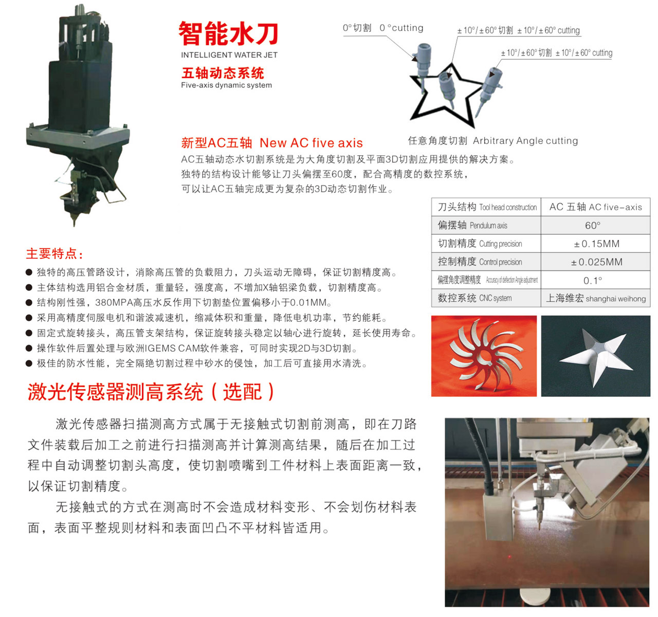 超高壓水切割機是通過高壓發生器把普通的自來水加壓,在經過直徑很小噴嘴的約束下,讓水的壓力提高至100~620Mpa,形成高速“水柱”,此水柱具有強大的能量,在水柱中加入少量磨料就成為超高壓水射流切割機,簡稱“水刀”,與微機控制的工作臺或機械手結合起來,形成數控加工系統,滿足特殊的、復雜的平面加工要求。 應用行業領域:航天航空,建筑裝修、機械船舶、玻璃行業、軍工行業、紡織造紙、汽車行業、電力行業、化工行業、木材加工、廣告行業、電子行業。